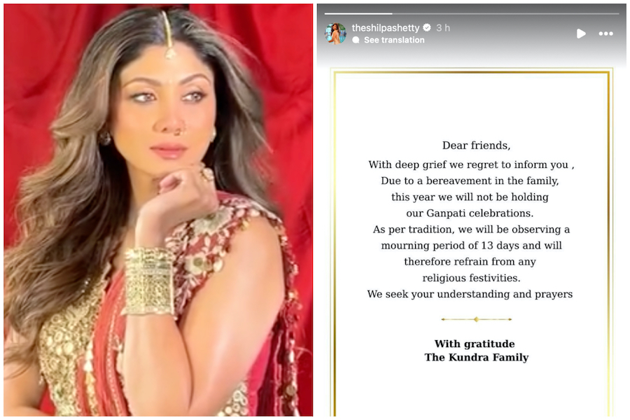 बॉलीवुड अभिनेत्री शिल्पा शेट्टी कुंद्रा ने सोशल मीडिया पर एक भावुक संदेश साझा करते हुए यह जानकारी दी कि इस वर्ष उनके घर में गणपतिउत्सव नहीं मनाया जाएगा। पोस्ट में लिखा गया, “परिवार में शोक के कारण, इस वर्ष हम गणपति उत्सव आयोजित नहीं करेंगे। परंपरा अनुसार, हम13 दिनों का शोक मनाएंगे और किसी भी धार्मिक आयोजन से दूर रहेंगे।” उन्होंने सभी से इस कठिन समय में समझ और प्रार्थनाएं मांगी हैं।