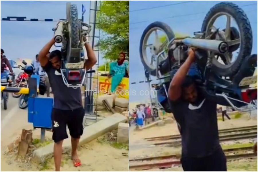 झांसी न्यूज डेस्क: झांसी में रेलवे क्रॉसिंग पर एक अजीबोगरीब वाकया हुआ। सोमवार शाम मोंठ थाना क्षेत्र के टोड़ी गांव के पास जब रेलवे फाटक बंद था, तब प्रदीप नाम का युवक अपनी 120 किलो वजनी बजाज प्लेटिना बाइक को कंधे पर उठाकर पटरी पार कर गया। गेटमैन ने उसे रोकने की कोशिश की, लेकिन वह बोला कि “मैं ऐसे ही पार करूंगा।” इस घटना का वीडियो किसी ने बना लिया और सोशल मीडिया पर डाल दिया, जो तेजी से वायरल हो गया।